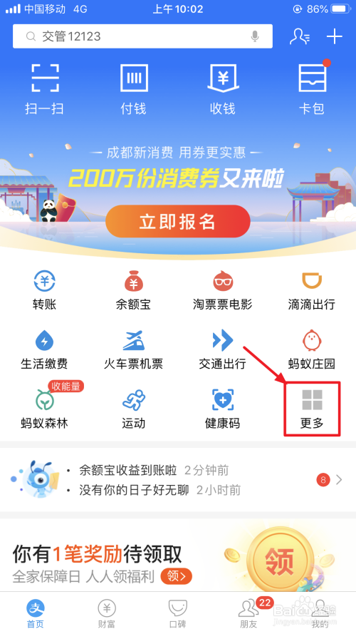 打开支付宝,点击“更多”,如下。