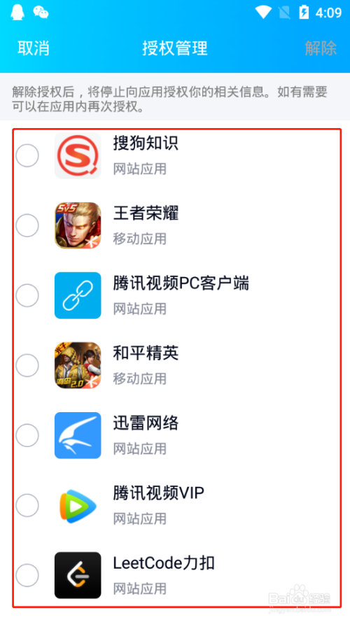 7、将想要解除授权的应用,打钩;再点击解除;然后再点击左上角的“打消”即可