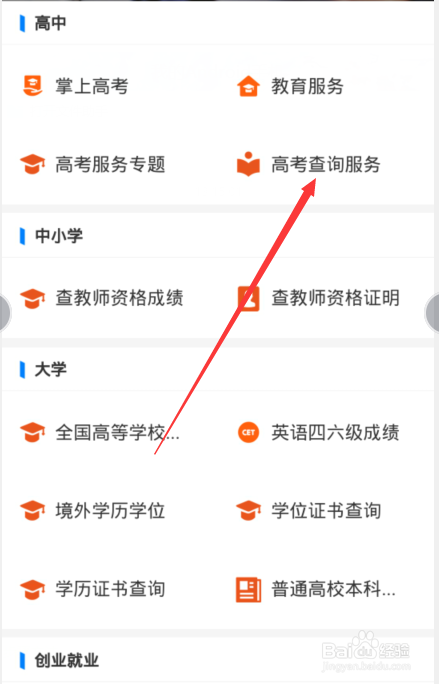 3、在高中栏面前目今面点击【高考查询办事】选项按钮。