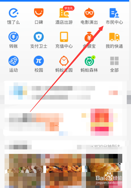 1、手机进入支付宝首页点击右上角的【市平易近中间】选项。