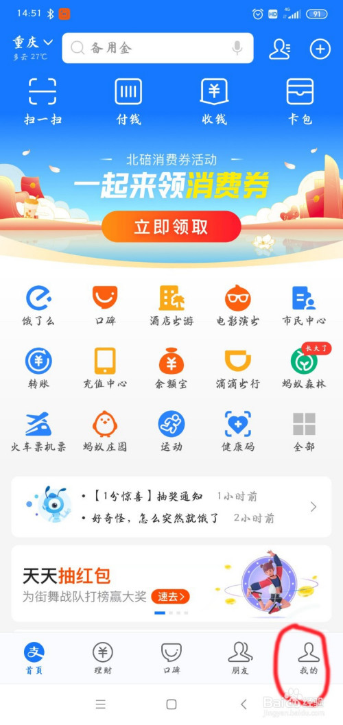 点击“支付宝”图标,进入支付宝程序本家儿页,可以看到右下角有一个“我的”标识表记标帜;