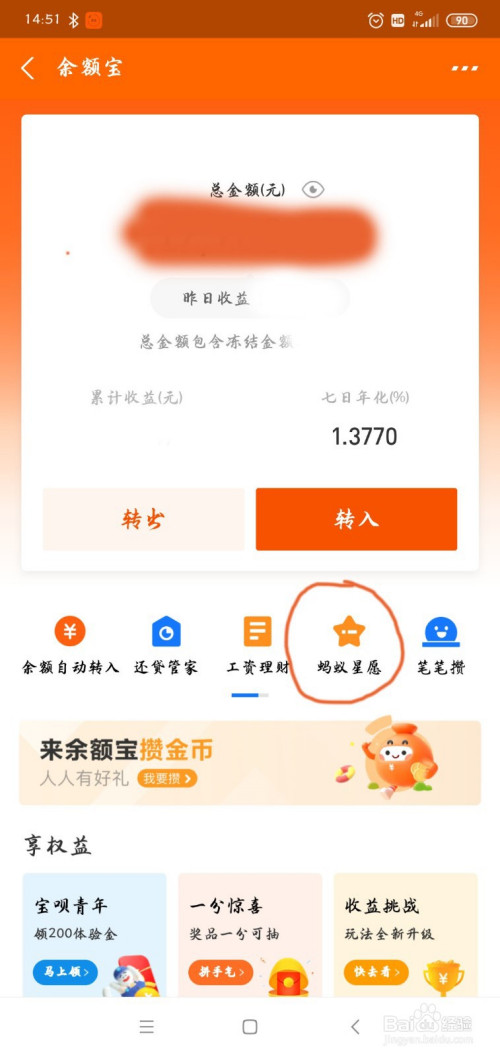 点击进入“余额宝”,在该页面上寻找星星(蚂蚁星愿)图标;