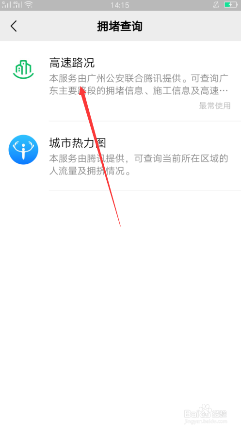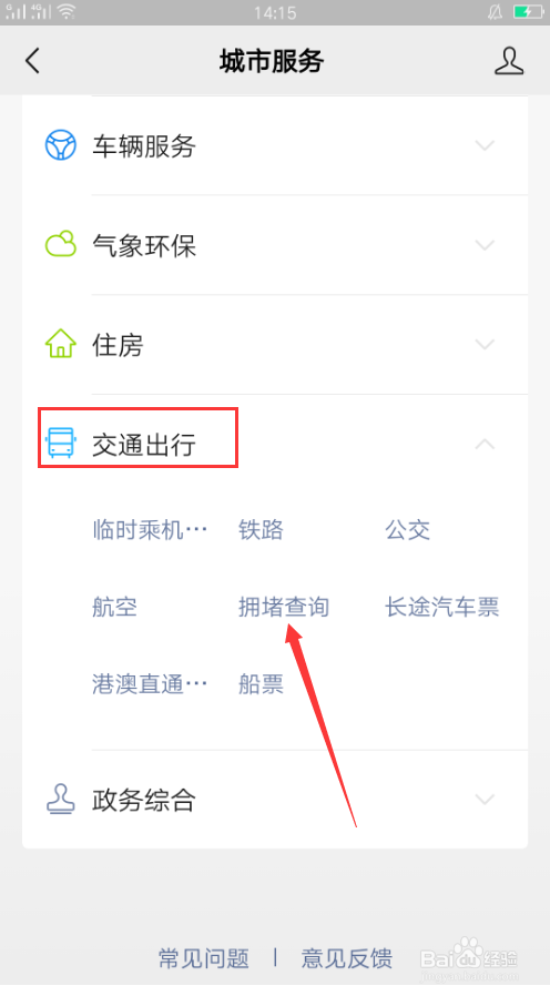 进入城市办事界面后,点击“交通出行—拥堵查询”。