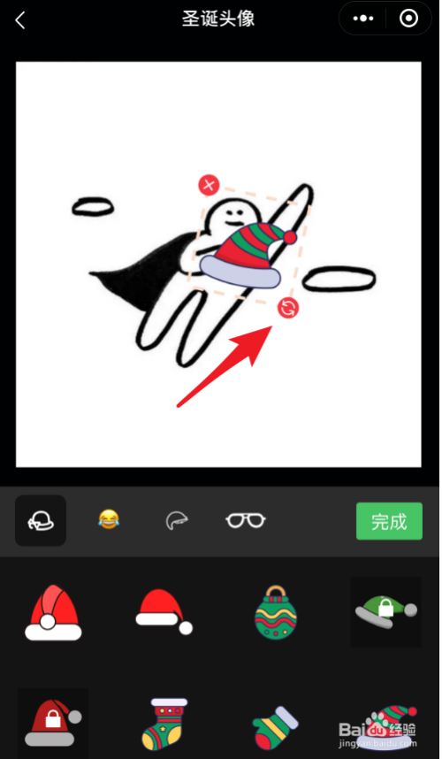 在页面下方的圣诞饰品窗口中,遴选喜好的圣诞饰品,点击它;然后,该饰品就会呈现在我们的建造头像上,经由过程点击饰品右下角处的【轮回】图标来调整饰品大小和角度,选中【饰品】可以移动它至合适的位置
