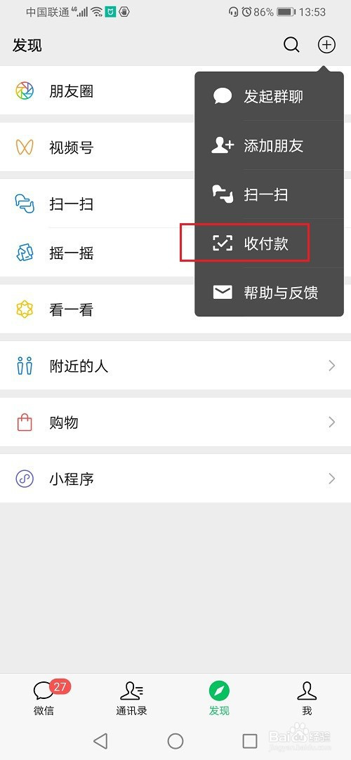 第一步打开微信,进去发现页,点击+号,然后点击收付条目