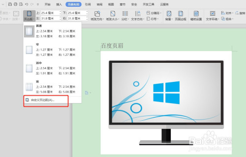 也可以点击页边距,在里面有通俗、窄、适中、宽四个模版供选择,若是要本身输入的话,点击【自界说页边距】