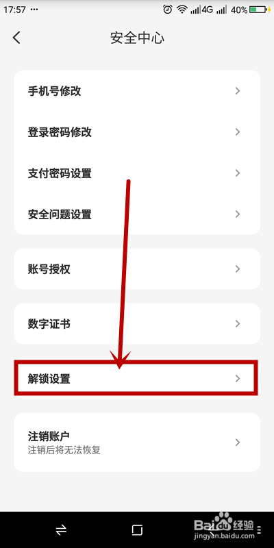 5、进入【平安中间】页面后,选择【解锁设置】选项单击