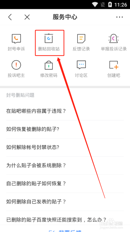 4、可以在上部门看到一个“删帖收受接管站”;选择进入