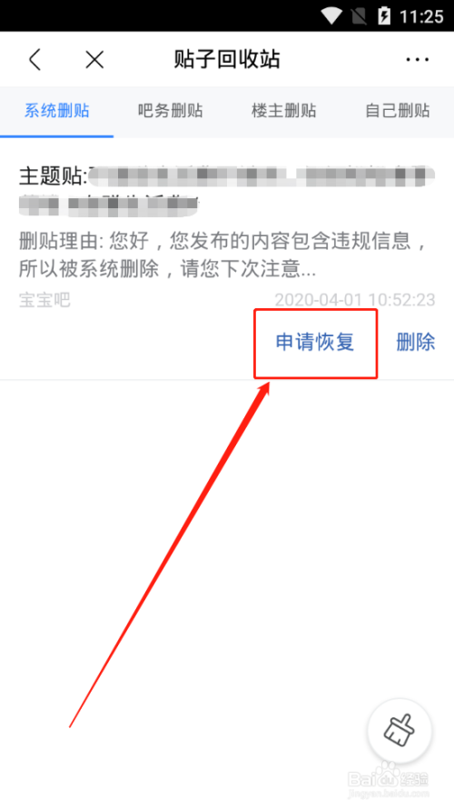 6、找到本身想要恢复的删帖,点击“申请恢复”
