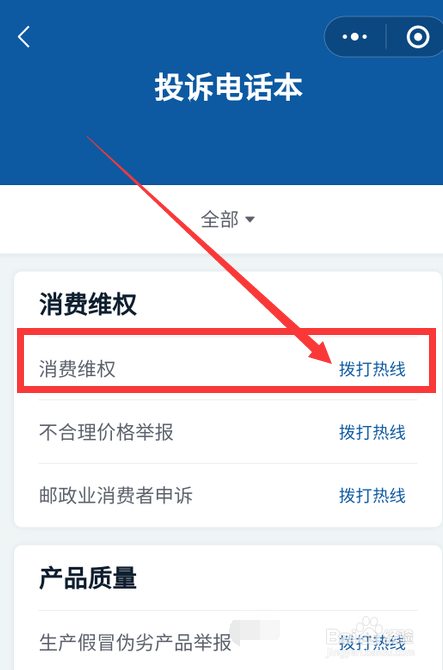 我们找到消费维权,点击右侧的拨打热线进行投诉即可。