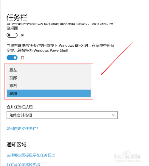 6、弹出来一个列表,列表中由”底部、靠右、靠左、顶部“四个使命栏的位置供您选择,点击一个需要的选项,即可设置完当作