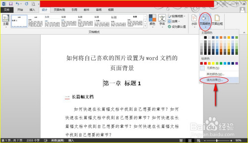 步调1:打开word文档,我们点击“设计”本家儿菜单,在其子菜单“页面布景”组中找到“页面颜色”子项。如图所示: