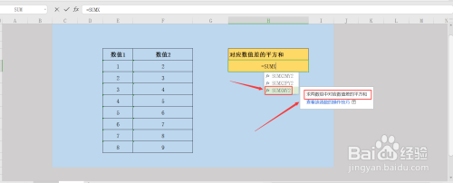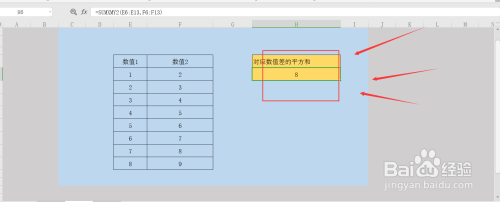 查看完函数介绍后,我们继续输入公式=SUMXMY2(E6:E13,F6:F13);