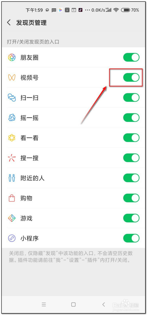 找到视频号的项目开启后面按钮