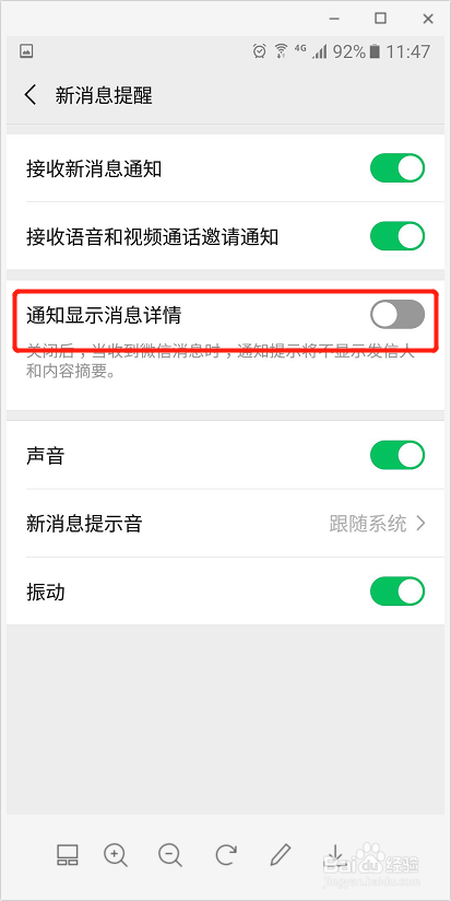 在新动静提醒页面,有一个【通知显示动静详情】,默认是打开的