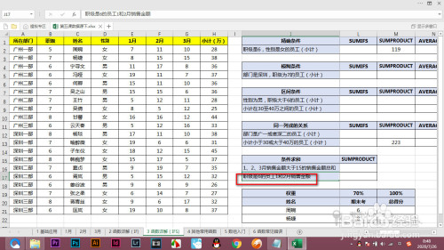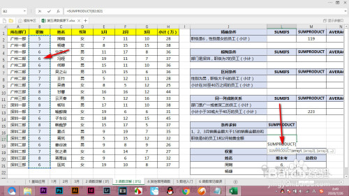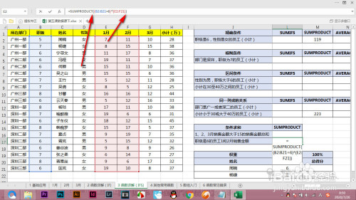 当前我们求一下职级是6的员工,一月和二月的发卖额综总和,涉及多个区域,要利用sumproduct求解。
