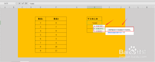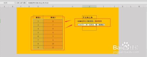 将公式弥补完整,=SUMX2PY2(E6:E13,F6:F13),即为对数值1、数值2两列数据进行平方计较和后再求总和;