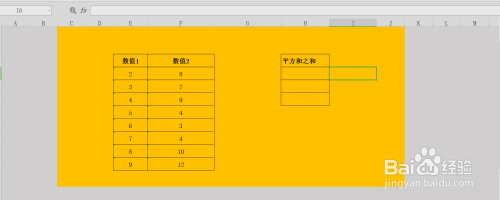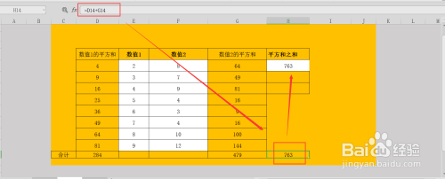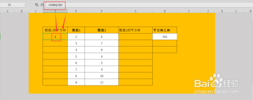 得出成果后,我们用比力原始的方式,来做下验证成果是否准确,先利用SUMSQ函数求出数值1、2两列数据各个数值的平方值;