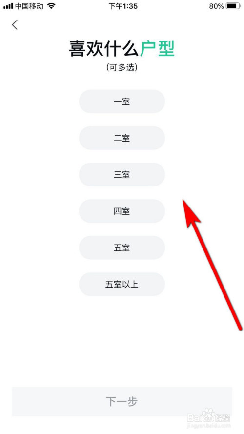 鄙人图中,选择想要查找的房源户型,点击下方的下一步。