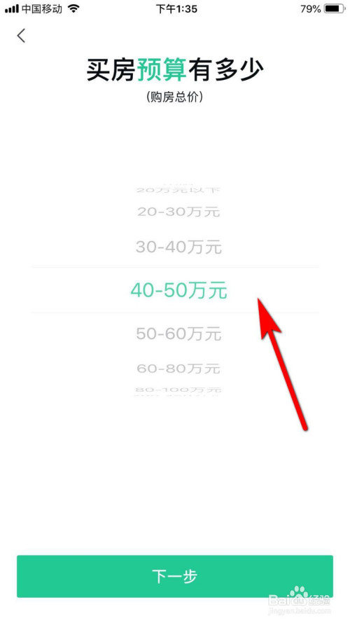 选择想要购房的预算,选择完当作后,点击下方的下一步。