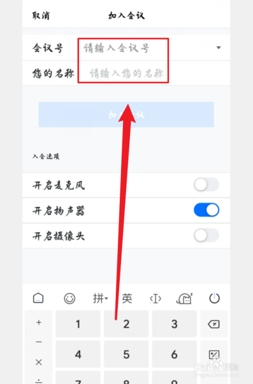 然后输入【会议号/名称】插手会议,若是已经建立会议可以忽略这两步。