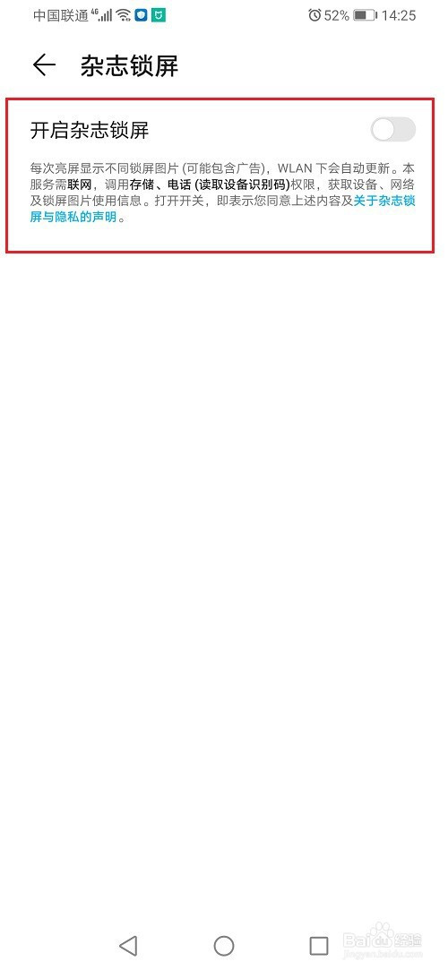 第三步进去华为手机杂志锁屏之后,可以看到开启杂志锁屏项是开启的