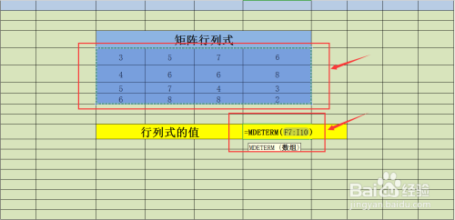 补全公式=MDETERM(F7:I10),意为求数据表行列式的值;