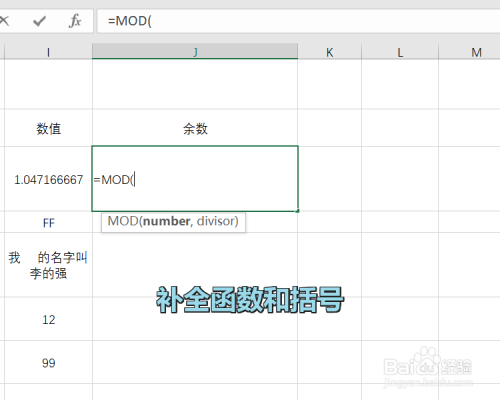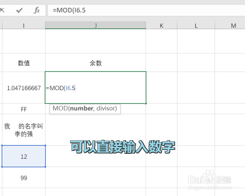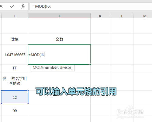 这个时辰就可以输入表达式了,MOD的参数是两个数字,可以输入单位格的引用