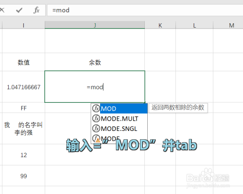 首先打开Excel,在单位格中输入“=MOD”然后按下Tab,只要提醒中第一条是您想要的函数就可以直接按Tab让系统补全