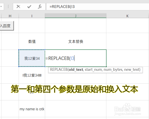 这时辰还会提醒此刻需要输入的参数是什么,REPLACEB的第一和第四个参数是原始和换入文本
