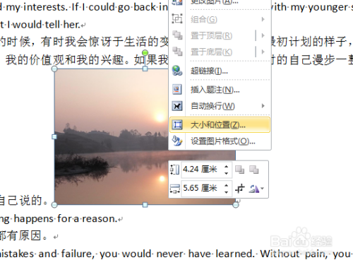 也可以选中图片,单击右键,选择“大小和位置”,实现对图片大小的调节!