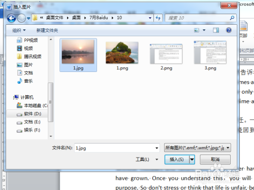 选择图片的插入路径,找到图片的地点位置,选中,点击“插入”;