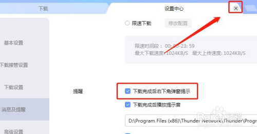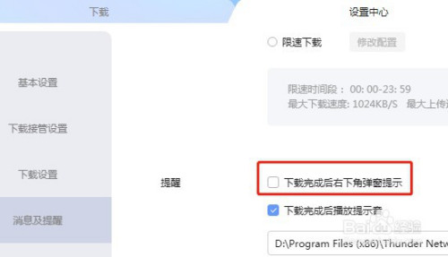 勾选【下载完当作后右下角弹出提醒】勾选项,退出设置中间即可