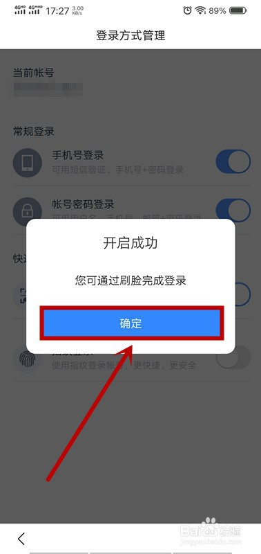 6.按照指示眨眼,开启刷脸登录当作功,点击“确定”。
