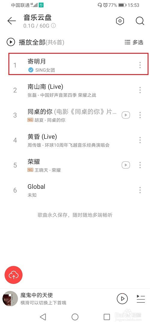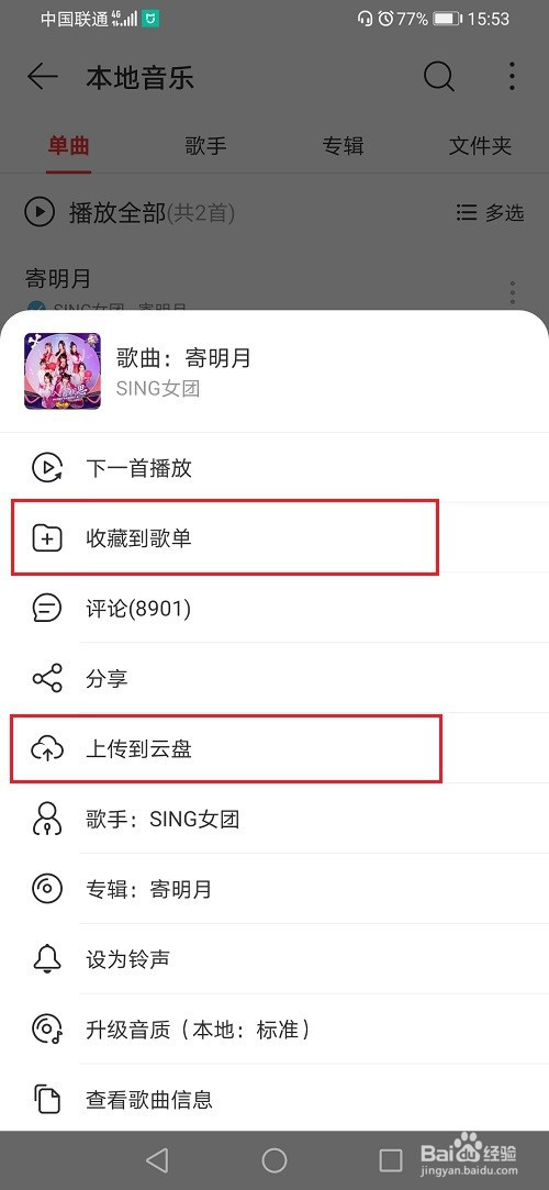 第五步点击上传到云盘,可以将当地歌曲上传到网易云音乐云盘,按照需要利用