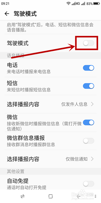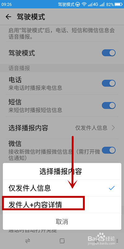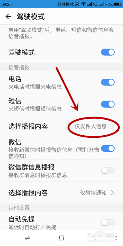 驾驶模式下开启播报信息内容的方式: