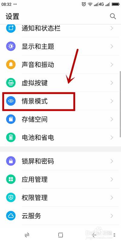 2、进入【设置】页面后,找到【情景模式】选项点击