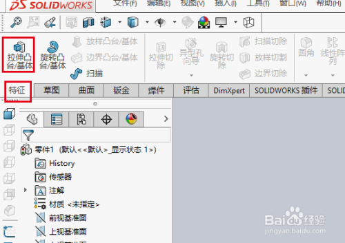 在菜单栏里面找到特征里面的拉伸凸台/基体号令。