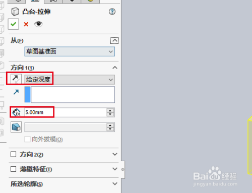 点拉伸凸台/基体号令,呈现一个如图所示的凸台——拉伸窗口,设置好拉伸的深度参数。