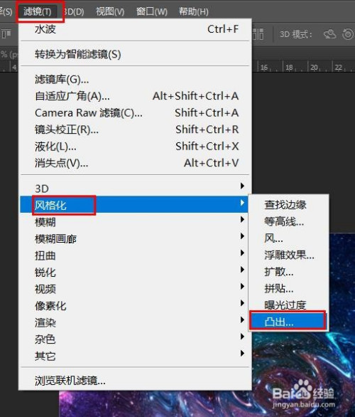 然后在菜单栏中选择“滤镜”-“气概化”-“凸出”选项。