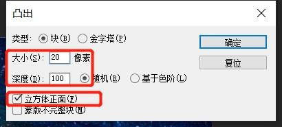 在弹出的“凸出”设置面板中,我们调整下大小和深度的参数,勾选上“立方体正面”。同样具体参数需要按照自身的前提设置,最好是本身测验考试分歧参数的结果。