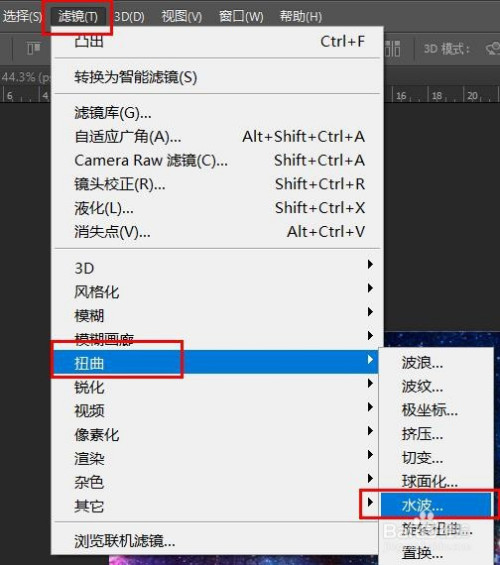 在菜单栏中选择“滤镜”-“扭曲”-“水波”选项。