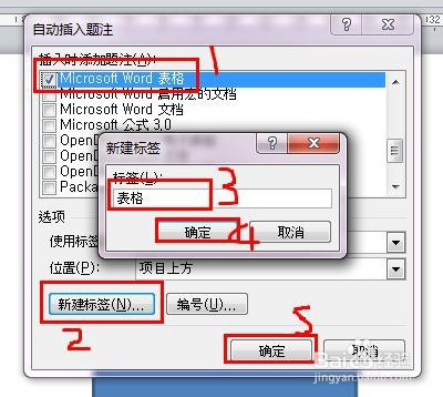 勾选“Microsoft Word 表格”,点击“新建标签”,输入“表格”,点击“确定”,再次点击“确定”