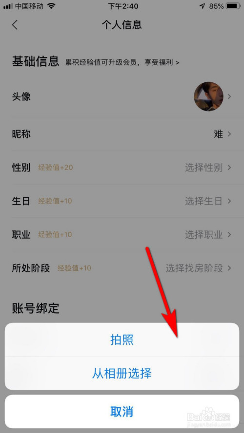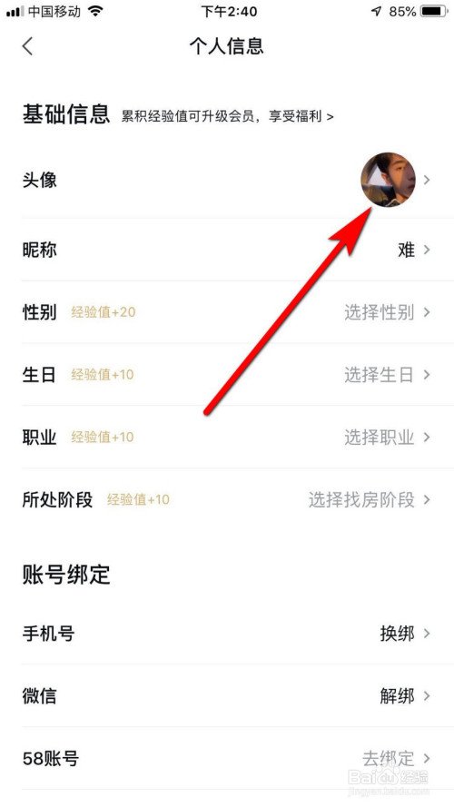 进入小我信息页面后,找到头像,点击头像,如下图箭头所指位置。