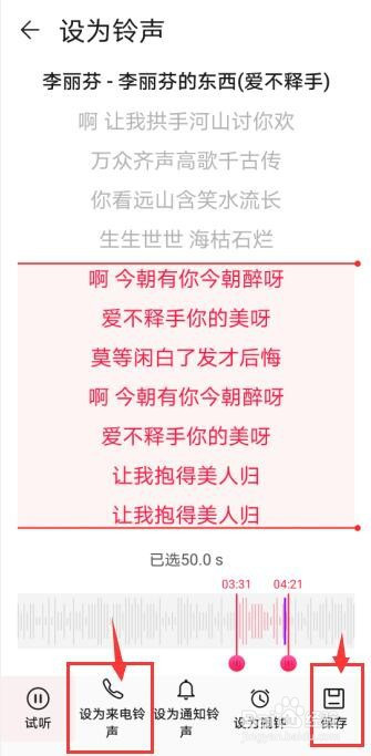 裁剪完当作后,可以点击保留到当地,然后到铃声里面去设置。或者直接点击设为来电铃声或通知铃声即可。
