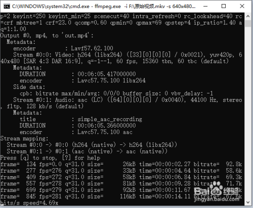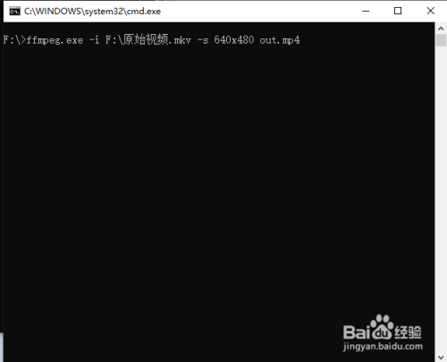 再点击一下号令行窗口,输入一个空格,再输入 -s 640x480 out.mp4,然后按回车。