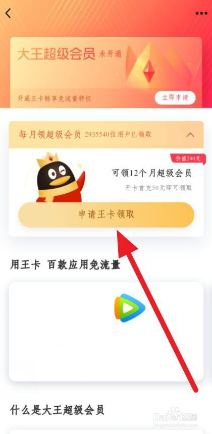进入王卡特权页面,点击申请王卡领取。