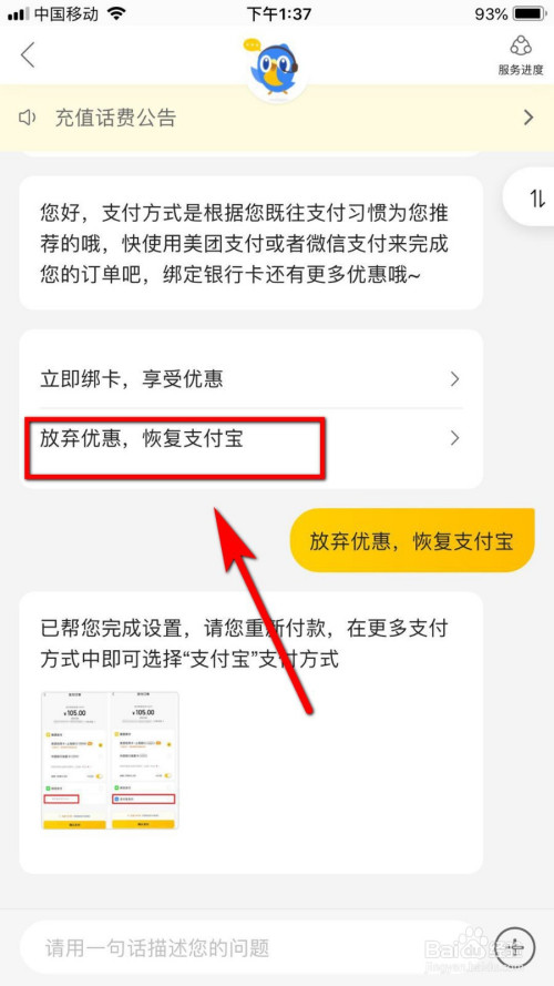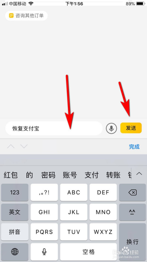 在客服页面中,找到底部输入框,输入恢复支付宝,点击发送。