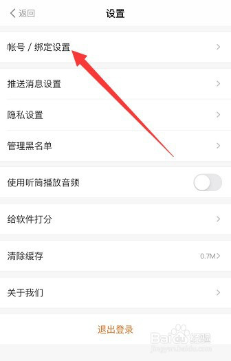 进入设置后,找到第一栏的“账号/绑定设置”,点击进入