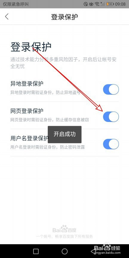 在打开的登录庇护页面,点击网页登录庇护后面的开关,把它设置为打开的状况就可以了。